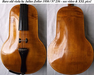 Probably1 of the only 2 left rare Julius Zoller violas left on the public market. This viola has the soundholes in the ribs (5 on each side), and has a 5th sympathetic string under the fingerboard tuned in F.