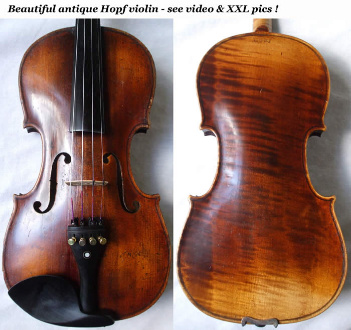 Fine old HOPF violin around 1st half 1800 - stamped on the upper back and inside the body. Please listen to the video / soundfile & click onto the image to see all detailed XXL photos below as part of the description! Nicely carved scroll and accurately inlaid purfling. No open cracks or open seams. The table is medium to fine grained spruce and the 1-piece back, as well as ribs and neck, is nicely flamed maple.The light-weighted instrument has been checked by our luthiers and by our violin player on playability. In our workshop it received new setup with newly fitted elder ebony pegs with mother of pearl dots, newly fitted elder tailpiece and chinrest, a new bridge, new soundpost and new strings. Good old German violin in immediate playing condition! Measures aprox.: total 58,5 cm / 23", body 35,5 cm / 14", vibrating chord length 31,5 cm / 12.4", weight 417 gr / ~14.74 oz.